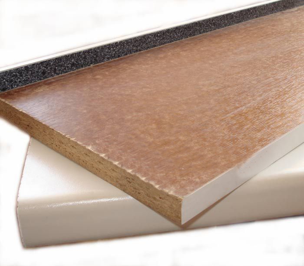 Основную часть подоконника составляет деревостружечная плита (ДСП) толщиной 18 мм, которая покрыта ламинатом (HPL) высокого давления толщиной 0,7 мм. Подоконники импрегрированы водостойким материалом класса V 100. Плита склеена клеем класса D3 |